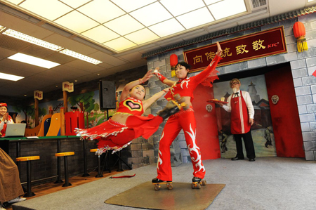 ——“向傳統(tǒng)致敬”集合在一起。一場傳統(tǒng)與創(chuàng)新的主題派對日前在肯德基北京前門餐廳舉行。 記者在活動現(xiàn)場看到,“肯德基爺爺”手里拿的,正是中國人喜聞樂見的經(jīng)典美食——油條豆?jié){。洋快餐賣起了豆?jié){油條,三字經(jīng)混搭現(xiàn)代歌舞、雜技玩起了滾軸、變臉變出奧巴馬和肯德基爺爺……在傳統(tǒng)演出中加以創(chuàng)新元素,在場觀眾在重溫經(jīng)典中感受到了新鮮和樂趣。 傳統(tǒng)與創(chuàng)新融合,更具生命力。肯德基近期連續(xù)推出的醇豆?jié){和霜糖油條兩款中式產(chǎn)品,目前醇豆?jié){產(chǎn)品成功入主肯德基常規(guī)菜單。新推出的“霜糖油條”在向傳統(tǒng)致敬的基礎(chǔ)上,又大膽創(chuàng)新突破,金黃色的油條批上了一層雪白的糖霜,既借鑒了中國的傳統(tǒng)美食,又融合了其他國家午后甜點的“洋”味道。 從老北京雞肉卷到燒餅米飯,再到豆?jié){油條,中國最傳統(tǒng)的美食飲品被洋快餐陸續(xù)擺上餐桌。專家指出,對于洋快餐來說,“向傳統(tǒng)致敬”既是一個向中國消費者示好的方式,更意味著他們看好傳統(tǒng)中國美食的較大市場空間。