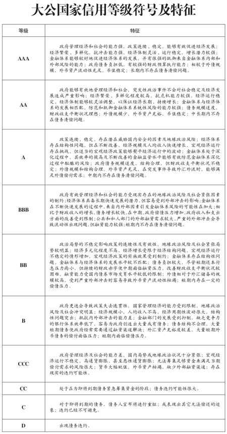 根據(jù)確定的影響國家信用風險五大關鍵評級要素及能夠刻畫這些要素的具體指標,大公建立了國家信用評級操作系統(tǒng)。錄入指標數(shù)據(jù),依據(jù)設定的評分方法和評分標準,系統(tǒng)會產(chǎn)生初始信用等級,之后經(jīng)過信用評審委員會的調(diào)整形成最終的本、外幣國家信用等級。其具體思路和步驟如下: 第一步,分別確定國家管理能力、經(jīng)濟實力、金融實力、財政實力及外匯實力的信用分值。 以國家管理能力為例,首先對其中的各項指標進行模型量化處理,接下來將得分加權平均,得到一國國家管理能力的最初得分,之后評審會會綜合考慮在模型中沒有體現(xiàn)的該國在國家管理能力方面的特有優(yōu)勢或劣勢,并通過國家間的比較,對初始得分進行一定調(diào)整,最后得到該國家的最終得分。分值區(qū)間從0到9,0分代表風險最高,9分代表風險最低。 第二步,對前四大要素進行加權平均,得到本幣信用分值,并將分值對應為信用等級。 大公國家信用等級從高到底,從AAA到D共十個等級。除“AAA”、“C”和“D”等級外,每個信用等級可用“+”或“-”進行微調(diào),分別表示比相應等級的信用質(zhì)量稍高或稍低。 第三步,綜合外匯實力得分,對本幣信用等級進行調(diào)整,得到外幣信用等級。 外匯實力很強的國家,外幣信用等級有可能超過本幣信用等級,但在多數(shù)情況下,外幣信用等級會等于或低于本幣信用等級。 這樣,最終得到了本幣和外幣的國家信用等級。下面列出大公國家信用等級符號及相應等級的信用風險特征。應強調(diào)的是,被評定為某一信用等級的國家,并非必須滿足該信用等級相對應的所有特征,但一般應滿足其中多項特征。