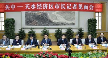 2010年4月9日,關(guān)中—天水經(jīng)濟(jì)區(qū)“七市一區(qū)”市長在西安與中外媒體記者見面,通報《關(guān)中—天水經(jīng)濟(jì)區(qū)發(fā)展規(guī)劃》實施情況。資料照片 |