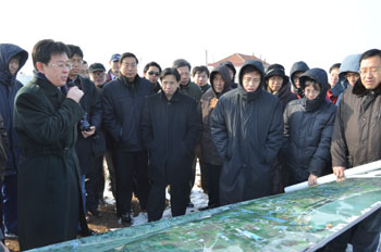 2010年1月,渤海海峽跨海通道課題組成員和國家發(fā)改委、交通運輸部、鐵道部等國家部委研究人員共同到蓬萊考察、調(diào)研工程線路、登陸地點。左二為蓬萊市市長張代令,左七為渤海海峽跨海通道課題組副組長、魯東大學(xué)副校長、環(huán)渤海發(fā)展研究中心主任柳新華教授。資料照片 |