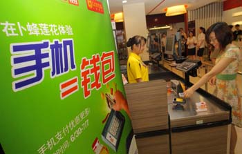 為了市場的良性發(fā)展,在爭奪利益之前,是不是應(yīng)該先把移動支付蛋糕做好再說?圖為一位市民正在上海某超市使用“手機錢包”進(jìn)行消費支付。新華社記者 裴鑫/攝 |