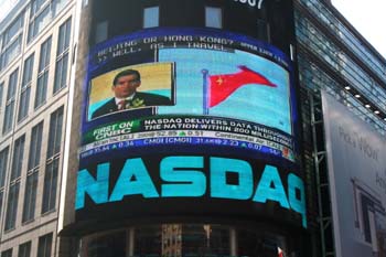 中國企業(yè)赴美上市的門票易得,但在適應(yīng)美國法律制度和理念上,還有待提高。圖為2007年4月3日,美國紐約時報廣場的納斯達(dá)克大型電視屏幕,納斯達(dá)克股票交易所在中國北京“遙控”敲鐘開市。資料照片 |