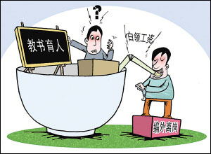 河南省郟縣有252個(gè)“編外離崗”教師,有的還不到40歲,但待遇卻與在職教師相同,坐在家里什么都不用干,工資照拿不說,而且還能晉檔晉級(jí),被戲稱為“白領(lǐng)”——白白領(lǐng)工資(9月14日 《中國(guó)青年報(bào)》)。 編外離崗算帶薪,捷足先登當(dāng)白領(lǐng)。 坐家晉升不費(fèi)事,笑納工資與獎(jiǎng)金。 世間最重是公平,教育腐敗傷人心。 撕破臉皮查個(gè)透,到底是誰(shuí)得了?