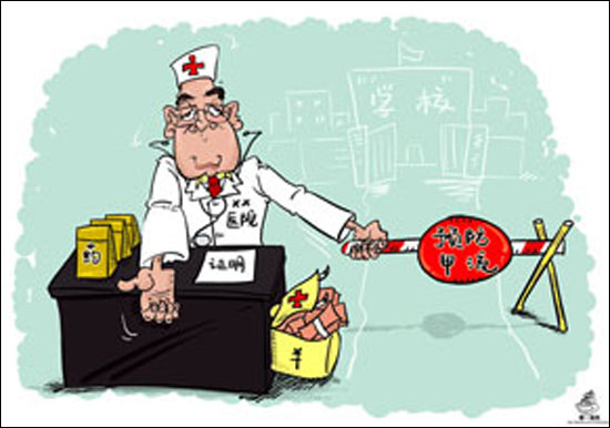 新聞背景:前幾天,平日冷清的河南新密市茍?zhí)面?zhèn)衛(wèi)生院突然熱鬧起來(lái)。學(xué)生家長(zhǎng)排隊(duì)搶購(gòu)衛(wèi)生院配制的預(yù)防甲型H1N1流感的中草藥。原來(lái),上周末,茍?zhí)面?zhèn)中小學(xué)和幼兒園學(xué)生都接到了一個(gè)特殊的任務(wù):到茍?zhí)面?zhèn)衛(wèi)生院買中藥,沒(méi)有這家醫(yī)院開(kāi)具的證明,不能上學(xué)。茍?zhí)面?zhèn)衛(wèi)生院坐等顧客,3天進(jìn)賬3.6萬(wàn)元。(11月7日