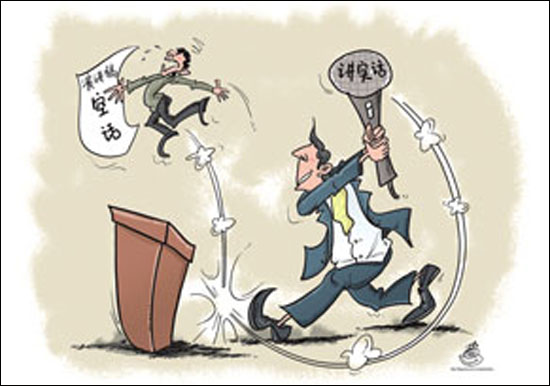 許昌市委書記在會(huì)議上對(duì)空話的“發(fā)飆”,不留余地,火力十足,讓很多人為之振奮,也收獲了很多贊譽(yù)。振奮和稱贊的原因,在于官員和老百姓都已經(jīng)習(xí)慣了各種場(chǎng)合的空話、套話,終于有人站出來大吼一聲,不僅讓老百姓解氣,更是官場(chǎng)中的新鮮事。 但細(xì)想一下,講空話不是新聞,被轟下臺(tái)就成了新聞,并非是件讓人徹底放心的事情。無論市民還是公務(wù)員群體,沒有人會(huì)認(rèn)為講空話是一件好事,“認(rèn)真查找問題”、“反對(duì)作風(fēng)漂浮”的要求也是年年在提,但結(jié)果卻是不僅空話本身成了空話,要求不講空話的規(guī)定也成了一句空話,只怕這才是問題所在。 書記對(duì)空話不滿,這或許值得嘉許,但更多的書記恐怕早已習(xí)慣了聽空話,甚至講空話。在權(quán)力對(duì)上負(fù)責(zé)的層級(jí)制下,上級(jí)的怒斥往往成為佳話,但也僅此而已。如果由人民評(píng)判的制度落在地面,講空話便不是被斥責(zé)這么簡單,不良的官場(chǎng)風(fēng)氣才有改進(jìn)的可能。 |