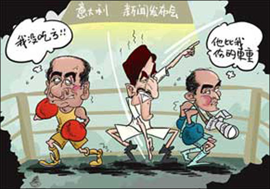 意大利總理貝盧斯科尼在10日舉行的一場新聞發(fā)布會上遭遇記者干擾,這位是非頗多的總理情緒再次失控,貝盧斯科尼稱這名記者不講秩序、不知羞恥,最后怒斥他為流氓,要求把記者趕出場。意大利國防部長拉魯薩也參與了這場“較量”。國防部長當裁判,一邊是一國總理,一邊是新聞記者,倆人我踢你一腿,你打我一拳,最后以平局收場。