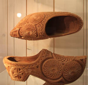 木鞋、風(fēng)車(chē)、郁金香,被并稱為荷蘭“三寶”。如今,多數(shù)荷蘭人早已不再穿著木鞋,它更多的成為游客必買(mǎi)的紀(jì)念品以及當(dāng)?shù)厝俗哂H訪友的禮品。但是在阿姆斯特丹北部10多公里外的小城贊丹的郊區(qū),還有一個(gè)小小的木鞋博物館,讓人們品味這荷蘭歷史與文化精雕細(xì)琢而出的精品。 在這家博物館門(mén)口,放著一只巨大的木鞋。據(jù)悉,這只長(zhǎng)約三米的木鞋由一整塊木頭制作而成,鞋面漆成黃色,并飾有紅色的條紋,號(hào)稱是世界上最大的木鞋。而走進(jìn)博物館,一條十余米長(zhǎng)的甬道一側(cè),則陳列著上百雙古老的木鞋。 “現(xiàn)存最古老的木鞋是大約800年前制作的,那是人們?cè)诼固氐じ浇牡叵乱馔馔诰虺鰜?lái)的。”胸前扎著一個(gè)木鞋飾物的博物館管理員馬塞爾·凱普敦對(duì)記者說(shuō),“直到上個(gè)世紀(jì)60、70年代,木鞋還在荷蘭人的日常生活中占有重要地位,但可惜如今,它更多的只是陳列品與紀(jì)念品了。” 由于木質(zhì)難以長(zhǎng)期保存,加上在幾百年前人們總是習(xí)慣于將舊木鞋當(dāng)作木柴燒掉,因此很難追溯木鞋起源的確切年代。但是木鞋發(fā)展的起因卻很清楚,那正是因?yàn)楹商m獨(dú)特的地理地形——全國(guó)國(guó)土面積約1/4低于海平面,人們?cè)诘屯萏锏乩锔饕约岸褖镜虊蔚绒r(nóng)業(yè)工業(yè)生產(chǎn)生活中,為了保護(hù)腳特別是腳趾而設(shè)計(jì)制作出這種款式獨(dú)特的木鞋。 “木鞋最大的優(yōu)點(diǎn)是安全,可以非常好地保護(hù)你的腳,”一邊說(shuō),穿著一雙藍(lán)色木鞋的凱普敦一邊抬起左腳狠狠地向右腳踩下去示意給記者看“特別是腳趾這樣容易受傷的地方。“根據(jù)不同的用途,荷蘭人對(duì)木鞋做了很多不同的設(shè)計(jì)和改進(jìn)。比如,在傳統(tǒng)的木鞋底下增加較大面積的橡膠墊,能夠幫助人們更好地在泥濘地里干活;給木鞋配上高高的橡膠套,則能夠在草叢密集的地方保護(hù)到腳和腿等更多的地方! 實(shí)際上,荷蘭的木鞋分類(lèi)極其之多。根據(jù)工作用途劃分有鋪石工木鞋、堤壩工木鞋、泥炭工木鞋、翻土工木鞋、漁夫木鞋、冰上木鞋等;而根據(jù)生活用途劃分還有專(zhuān)門(mén)的禮拜鞋、周末木鞋、新娘木鞋等等。 凱普敦介紹說(shuō):“制作木鞋的最佳材料是楊木,當(dāng)然還有柳木。不過(guò)柳木相對(duì)較少,而且價(jià)格更貴,所以日常用得最多的還是楊木!辈┪镳^內(nèi)有一小塊區(qū)域?qū)iT(mén)展示木鞋制作工藝。通常,人們需要將樹(shù)干根據(jù)其外形切成木樁,而后根據(jù)具體鞋的大小再切成木塊。隨后,匠人利用斧子以及條刀切割出木鞋的外形,再用匙鉆等工具挖出鞋的內(nèi)部空間。之后,還需要經(jīng)歷風(fēng)干、打磨以及涂繪等工序。一雙木鞋的誕生,大約需要經(jīng)過(guò)總共25道工序。 指著墻上的一副照片,凱普敦說(shuō):“你看,這是幾十年前人們舉行傳統(tǒng)的冰上婚禮的照片,人人都穿著木鞋!睔v史上,木鞋曾經(jīng)在荷蘭人的戀情中占有獨(dú)特的重要地位!叭绻粋(gè)小伙子向心上人贈(zèng)送的木鞋被接受了,那就說(shuō)明姑娘也愛(ài)上了他!辈┪镳^里就展出了許多這樣精致的新娘木鞋,它們鑲有小玫瑰、星星、魔紐等圖案,表達(dá)著人們對(duì)愛(ài)情的美好期待。 “很多人都以為木鞋很笨重,其實(shí)它很輕便,不信你試試!”凱普敦脫下腳上的那雙漂亮的藍(lán)色木鞋,讓記者穿上,果然很輕,甚至和記者原先穿著的那雙運(yùn)動(dòng)鞋分量相當(dāng),抬腳邁足,幾無(wú)不便!暗牵愦┥夏拘荒芟衿匠D菢幼呗,而必須將腳勾起來(lái)往前邁,腳掌先落地,否則,堅(jiān)硬的木鞋會(huì)傷到你的腳背和腳踝! “畢竟,現(xiàn)在不是以前,”凱普敦指著一雙被涂繪成如今標(biāo)準(zhǔn)的系帶皮鞋模樣的木鞋說(shuō):“即便是那些喜歡木鞋的人,也希望能將木鞋做得像皮鞋一樣,”突然之間,這位頭發(fā)灰白的長(zhǎng)者輕嘆一聲,“他們做到了!倍壑,閃過(guò)一絲淡淡的憂郁。