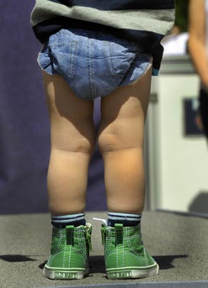 一名初學(xué)走路的兒童在紐約舉行的一個(gè)嬰幼兒時(shí)裝展上展示一款“牛仔”紙尿褲。