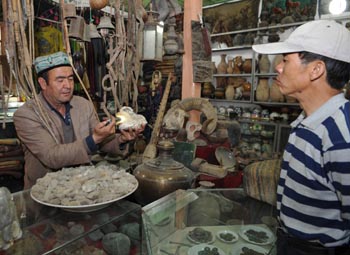 “你知道我的夢想是什么嗎,我想收集齊中國56個民族每個民族的特色藏品,讓我的民間博物館成為最豐富的民族收藏品展館!薄 ≌f這話的,是新疆喀什的一位維吾爾族民間收藏家艾尼·阿布拉。他的博物館位于當?shù)刈钪睦铣歉吲_民居上,琳瑯滿目的各樣藏品讓進入其中的游客目不暇接。 一個春日的午后,記者信步走進迷宮般的喀什老城,七彎八繞中,一條小巷的一角,“高臺民居文物博物館”吸引了記者的目光。順著敞開的大門望進去,地下隨意堆放著大大小小的石頭,墻壁上掛著大幅手繡的毛澤東、列寧等人物的掛像。 穿過小小的院子,走進10多平方米的博物館,民間收藏家艾尼·阿布拉就和他的收藏品一起出現(xiàn)在眼前:土陶、紡車、銅器、刺繡、紡織品、留聲機、古錢幣、瓷盤、經書、化石……讓人一走進去,就像走進了歷史。 “我從小就熱愛收藏,10多歲起就喜歡到處去收些古物件,現(xiàn)在我有5萬多件藏品,大多數(shù)是與新疆各地各民族的生活有關的! 艾尼·阿布拉向記者展示了他的鎮(zhèn)館之寶——一枚羊頭化石。這枚化石長10多公分,顏色發(fā)白,分量不輕,完整的山羊頭型和兩排牙齒清晰可見,用小手電照進去,整塊化石清亮通透,十分稀罕。像這樣稀奇的物件,艾尼的民間博物館中還有很多,隨手拿起一件,都能聽到一個古老的故事。 喀什是中國最西部的城市,作為古絲綢之路上的商埠重鎮(zhèn),喀什還是我國首批旅游文化名城之一。深厚的歷史文化積淀和多元化的民俗風情使喀什市成為新疆最受游客喜愛的旅游目的地之一。 從小就游走在新疆各地喜愛收藏的艾尼·阿布拉,熱衷于收藏有關民族的古物:古色古香的少數(shù)民族燭臺、不同朝代不同民族的服裝服飾、孫中山和宋慶齡合影的細瓷盤、杭州都錦廠造的孫中山、毛澤東等人的織錦畫像、用金粉書寫的古蘭經、年代久遠的鐵制佛頭、官印……每個物件背后,都有著一串串的故事。 2002年,看到越來越多的游客涌入喀什老城中的高臺民居,艾尼·阿布拉終于為他幾十年來的淘寶生涯找到了出口:開辦個人博物館,展示新疆傳承久遠的歷史文物,讓游客通過他的博物館了解新疆各地的歷史文化。“我的客人很多,有美國的、德國的、日本的、土耳其的,還有很多來自內地的游客,他們喜歡通過這些古老的東西了解新疆,也愿意聽我講故事! 為了實現(xiàn)自己收藏各民族文物的理想,艾尼·阿布拉常常獨自一個人跑到周邊的州縣少數(shù)民族聚居區(qū)去收購老物件,柯爾克孜族、塔吉克族、塔塔爾族……許多人口較少民族手工制作的精美用具都被艾尼收了回來,而這些充滿記憶的收藏品展示在喀什老城古老、神秘、幽深的民居中,讓人仿佛回到了幾百年前的古街深巷。