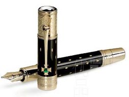 藝術(shù)贊助人“伊麗莎白一世”為888系列K金墨水筆配以名貴的焗漆筆桿及筆帽,18K金筆嘴刻有皇冠圖案,象征女皇1559年登基時佩戴的冠冕;筆帽頂鑲珍珠貝母萬寶龍六角白星標(biāo)志,飾以都鐸王朝玫瑰K金徽章;筆夾則鑲有一顆方形綠色石榴石,與女皇皇冠的珠寶飾呼應(yīng);而女皇年輕時自制《The