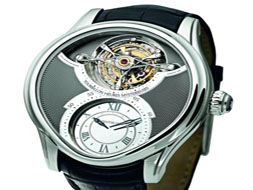 萬寶龍維萊爾1858系列陀飛輪神秘時間鉑金腕表這款鉑金腕表旨在紀念萬寶龍精致腕表的機芯制造商Minerva。它融合了兩項獨特設計:一是陀飛輪,內含95枚零件,重量卻不足一克;二是置于透明圓盤上的“神秘時間”指針,宛如浮在空中。表殼:鉑金材質,水滴造型,鉑金底蓋。表盤:黃金材質,配以紐索飾紋,12點位置是陀飛輪顯示窗口,6點位置則是“神秘時間”顯示窗口,鏤空指針,菱形刻度與羅馬數字時標交替排列機芯:手動上鏈機芯,配備陀飛輪,28枚寶石軸承,45小時動力儲備,每小時振頻18,000次。功能:時、分顯示。