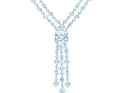 蒂芙尼的設(shè)計(jì)師們將美麗和優(yōu)雅定格在圓形、枕形和橄欖形鉆石項(xiàng)鏈上。這條項(xiàng)鏈的中心是一顆20.01克拉、D色、凈度為IF(內(nèi)部無雜質(zhì))級(jí)的鉆石。頂級(jí)的切割技術(shù)造就了這顆鉆石無與倫比的光華和魅力。