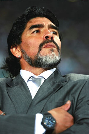 2008年11月4日,時年48歲的馬拉多納成為了阿根廷隊的主教練。在世界杯開幕之前,他聽從女兒的建議穿上了西裝,阿根廷《獨立報》這樣評價道,“這標(biāo)志著馬拉多納清楚地認(rèn)識到,自己不能在球場上親自施展奇跡了。”脫掉球衣穿上西裝,并且在左右手腕均戴上了Hublot腕表。馬拉多納從踢球的上帝變?yōu)榱艘幻麤Q策者,阿根廷隊的帶頭大哥。 在現(xiàn)在的這只阿根廷隊中,幾乎所有隊員都是看著馬拉多納踢球長大的。因此,馬拉多納能夠?qū)⒆约禾咔驎r的反叛氣質(zhì)毫無保留地注入到這支隊伍中。很多人都認(rèn)為馬拉多納的這支阿根廷隊并不是完美無缺的,但是這并不妨礙隊員們一次次撕開對手的防線,以最匪夷所思的方式將足球送進對手的大門。整個過程輕松到他們的前鋒伊瓜因只需要在門前1米處將皮球輕巧地改變一個方向,便可以完成致命的最后一擊。 這是馬拉多納式的勝利,缺乏理性的邏輯,但卻痛快淋漓。實際上,在馬拉多納之后,人們總是喋喋不休地討論著誰將成為他的接班人。而在本屆世界杯上,梅西終于讓所有質(zhì)疑的聲音消失。梅西在比賽中只有一種戰(zhàn)術(shù),這就是馬拉多納戰(zhàn)術(shù)。馬拉多納完全將梅西當(dāng)做1986年的自己,而尋找馬拉多納的接班人,這簡直成了阿根廷隊必須完成的一種宗教儀式。