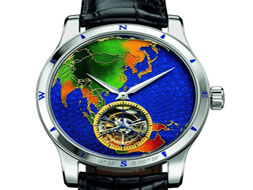 這款鉑金腕表的表盤采用內(nèi)填琺瑯,并以不同地理區(qū)域為主題,精心雕刻三款不同表款:亞洲和澳大利亞、美洲和歐洲,以及非洲和中東,其中陸地和海洋分別飾以日輝紋和波浪紋。每款限量生產(chǎn)20枚。表殼:鉑金材質(zhì),圓形表殼,表圈采用雕花刻度和基本方位,藍寶石水晶底蓋,可顯示機芯運轉(zhuǎn)。表盤:以地理區(qū)域為主題的內(nèi)填琺瑯彩繪微縮畫,阿爾法形指針機芯:自動上弦機芯,配備陀飛輪,302枚零件,33枚寶石軸承,48小時動力儲備,每小時振頻28,800次。功能:時、分、小秒針顯示。