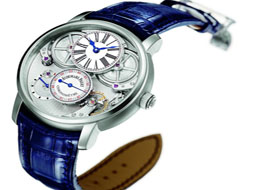 Piguet精心設(shè)計和制造的該款擒縱系統(tǒng),毋需上油潤滑,便可直接將動力傳送至平衡擺輪,其振頻高達每小時43,200次。超高振頻可大幅提高表的走時精度。表殼:鉑金材質(zhì),圓形表殼,藍寶石水晶底蓋,可顯示機芯運轉(zhuǎn)。表盤:琺瑯材質(zhì),斯圖亞特式指針,羅馬數(shù)字時標(biāo),雙軌分鐘刻度。機芯:手動上弦機芯,配備愛彼獨家擒縱系統(tǒng),267枚零件,34枚寶石軸承,56小時動力儲備,每小時振頻43,200次。功能:時、分、小秒針、動力儲備顯示。