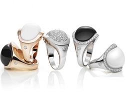 兩款最新設(shè)計(jì)的戒指采用白金材質(zhì)綴以黑色縞瑪瑙或者白瑪瑙,用鉆石搭配,在設(shè)計(jì)和外觀上令人眼前一亮?傊亓窟_(dá)0.8克拉的裝飾鉆石由不同大小的圓形明亮鉆石構(gòu)成,凸顯黑色或白色寶石與黃金的柔性美之間的強(qiáng)烈對(duì)比。 兩款戒指中寶石的選擇為純白色或者醒目黑色,這不僅映襯出萬(wàn)寶龍的品牌身份,更是頂級(jí)珠寶世界中經(jīng)典有力的顏色,令人聯(lián)想到大膽性感或者純粹寧?kù)o。五款戒指中的每一款都彰顯了女士珠寶佩戴的獨(dú)特品質(zhì)——優(yōu)雅,成熟,自信。