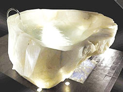 一個意大利生產(chǎn)的精美絕倫的水晶浴缸日前開出了79萬美元(約合人民幣535萬元)的高價!這個長2米、高55厘米的浴缸來自意大利,是用一塊巨大的白色水晶石雕刻而成的。這塊水晶石于2006年在巴西亞馬孫河流域被開采出來,外表看上去完美無瑕而且晶瑩剔透,經(jīng)萃取后原封不動地送往意大利。在那里,別具匠心的設計師把它打造成一個美輪美奐的浴缸,并精選鉆石配飾加以點綴。