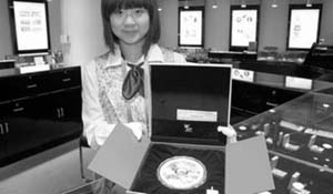 圖為老鳳祥銀樓員工向記者展示“世博金銀大同章” |