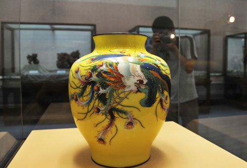 7月23日,《南北兩院珍藏日本瓷器精品特展》在長(zhǎng)春偽滿皇宮博物院正式開(kāi)展。展覽共展出了由長(zhǎng)春偽滿皇宮博物院和廈門華僑博物院收藏的110多件日本精品瓷器。展覽將一直持續(xù)到9月中旬。圖為一位參觀者在為“日本黃地彩鳳凰七寶燒壺”拍照。