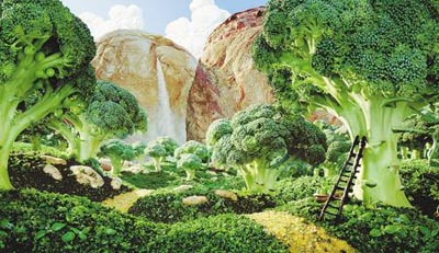 日前,英國攝影師Carl Warner開創(chuàng)了一種獨特的風景攝影形式:畫面所呈現(xiàn)的色彩和形狀都是用蔬菜和水果制作而成。他把這種特殊的藝術(shù)形式命名為“食物風景攝影”。他的作品因其獨特的創(chuàng)意、濃郁的夢幻氣息、別出心裁的構(gòu)圖,讓人震撼。