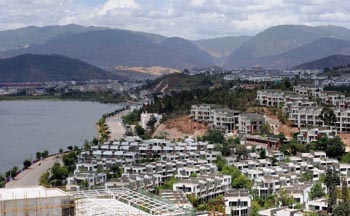 這是“洱海天域”度假產權式酒店項目俯瞰,在建的酒店和別墅群距離洱海最近距離僅有10多米,別墅群中心位置就是以前“情人湖”的所在地。新華社記者 藺以光