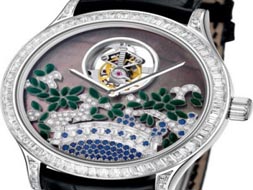 梵克雅寶花園系列腕表以世界四大經(jīng)典花園為創(chuàng)作靈感,點綴寶石及美鉆,彰顯各地的自然風(fēng)情與獨特的文化韻味。腕表采用白K金制作表殼,表圈鑲嵌方形美鉆,讓琺瑯表盤沉穩(wěn)內(nèi)斂的主題更顯亮麗。半圓磨光琺瑯上,藍(lán)寶石、鉆石等描繪出英式花園的迷人景致,小橋流水、枝繁葉茂都帶來春回大地的喜悅,其靈感來源于維多利亞花園繁華盛放的景象。除了珠寶鑲嵌、琺瑯工藝以外,腕表亦結(jié)合了陀飛輪工藝。腕表裝載陀飛輪旋轉(zhuǎn)機芯,其框架位于表盤12時位置,有效地抵消方位差的影響,讓走時更精準(zhǔn)。