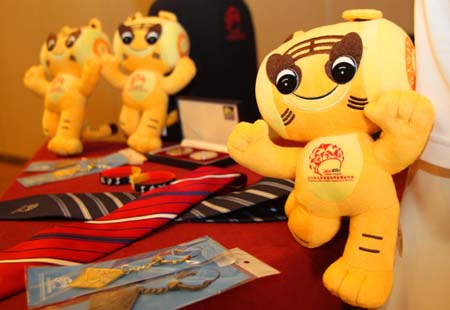 8月10日,2010年北京首屆世界武搏運(yùn)動(dòng)會特許產(chǎn)品、紀(jì)念郵品新聞發(fā)布會在中成天壇假日酒店舉行。會上發(fā)布了吉祥物、紀(jì)念章、鑰匙扣等紀(jì)念商品以及個(gè)性化郵票票折、明信片等特許郵品,供廣大體育迷與集郵愛好者購買、收藏。圖為武搏會吉祥物“冬冬”。