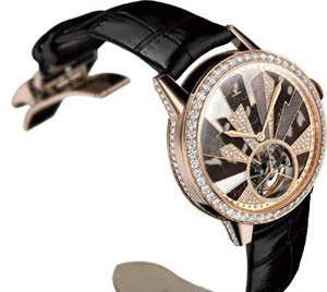 以多種極富女性魅力的元素裝飾陀飛輪腕表,是積家這款女裝陀飛輪腕表最吸引人眼球之處。這種流光溢彩的組合方式,不僅完美地將陀飛輪裝置與精湛的裝飾工藝融為一體,更展現(xiàn)出優(yōu)雅細(xì)膩的不凡氣度。腕表以18K玫瑰金制造表殼,直徑39毫米,更適合女性纖細(xì)的手腕。表盤設(shè)計靈感來源于裝飾藝術(shù)風(fēng)格,珍珠貝母、璀璨美鉆和美麗的羽毛拼鑲出簡潔大氣的幾何圖案,華美中不乏現(xiàn)代女性特立獨(dú)行的氣質(zhì)。腕表搭載積家978型自動上鏈機(jī)芯,動力儲存45小時。絹質(zhì)表帶,搭配鑲嵌鉆石的金屬折疊式表扣。此外,腕表亦有白金版,其中18K玫瑰金款鑲嵌315顆重約2.9克拉鉆石,白金款鑲嵌341顆重約3.2克拉鉆石。