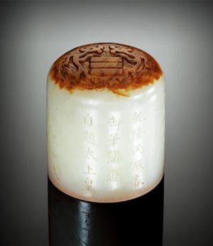 2010年4月8日,在香港蘇富比“中國(guó)瓷器及工藝品春季拍賣會(huì)”上,清乾隆御寶題詩(shī)“太上皇帝”白玉圓璽(以下簡(jiǎn)稱“白玉圓璽”)成為整個(gè)拍場(chǎng)的亮點(diǎn)。該方圓璽曾出現(xiàn)在2007年香港蘇富比的拍賣場(chǎng)上,當(dāng)時(shí)以4625萬(wàn)港元刷新了御制印璽的世界拍賣紀(jì)錄,作品再次上拍,引發(fā)多方關(guān)注。 拍賣當(dāng)日,現(xiàn)場(chǎng)競(jìng)拍異常激烈,拍賣價(jià)格呈階梯狀不斷上升。在16輪競(jìng)拍之后,一位現(xiàn)場(chǎng)買家以8500萬(wàn)港元將這枚珍貴的印璽收入囊中,加上傭金,“白玉圓璽”的成交價(jià)為9586萬(wàn)港元。時(shí)隔兩年,這一方御用印璽在拍場(chǎng)上的價(jià)格就翻了一番,升值4000多萬(wàn)港元。
