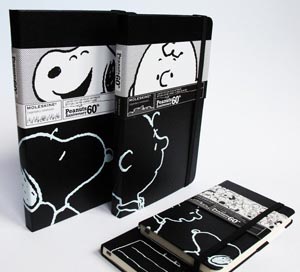 《花生漫畫(huà)》一向極受歡迎,角色之間的有趣對(duì)話是不可或缺的靈魂。 本著這個(gè)特色,口袋筆記本的封面便呈現(xiàn)出角色之間的互動(dòng)和交流。 《花生漫畫(huà)》最具代表性的角色亦會(huì)個(gè)別地出現(xiàn)在大型筆記本封面上,包裝紙條分別印上兩個(gè)主要角色史努比和查理-布朗的特寫(xiě),筆記本上以白色刻上人物的側(cè)面。在兩本Moleskine紙條和封面上們都會(huì)印有“Peanuts
