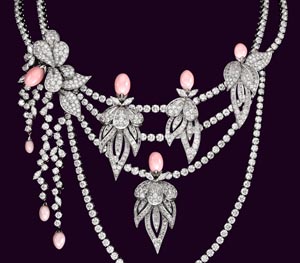 都比它第一眼看上去要復(fù)雜的多。正像要佩戴珠寶的女人一樣,只能在近距離欣賞的時候,才能充分品味珠寶背后的魅力所在。一眨眼的工夫,中央的裝飾圖案會變成一個胸針,吊墜變成耳環(huán),或一個復(fù)雜的項鏈扣變成一個發(fā)夾。每一款式都具有多種功能,將誘惑的藝術(shù)變成佩戴珠寶女人欲望所主宰的游戲。