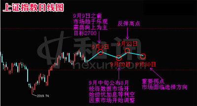 點。中國經(jīng)濟長期向好毋庸置疑,在此溫和通脹的宏觀背景下,股市中期仍然將會保持振蕩上漲格局,就9月份而言,銀行、地產(chǎn)、有色、鋼鐵、石化、航空航運、煤炭采掘等行業(yè)總體處于較低估值水平,向下空間的相對有限,也封殺了大盤下跌空間。 因此總體上,9月將呈震蕩向上格局,月初9月9日拐點之前偏于樂觀,2700點仍可見到。而后,因為9月中旬8月宏觀經(jīng)濟數(shù)據(jù)出爐,通脹等因數(shù)將令市場重新?lián)鷳n央行加息提準等利空因素,如果這種擔憂引發(fā)調(diào)整,那么調(diào)整或?qū)⒊掷m(xù)至9月20日時間窗口。隨后市場反彈至23日見高點后,調(diào)整至30日。因為十一長假即將來臨,周邊市場不確定加大,月底30日將是一個成交低迷期,市場面臨重新的方向性選擇。