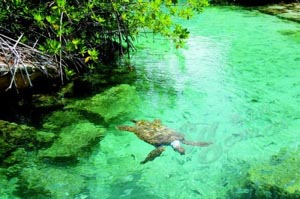 Mayakoba酒店,并以一場加勒比海畔的私人雞尾酒會為假期揭開了序幕。曾被《紐約客》及《紐約時報》冠以“海洋女皇”美譽的Sylvia在簡單的開場白中為大家講述了她的故事:3歲時,當(dāng)海浪拍打她的小腳,她就愛上了海洋。長大成人后,她曾率領(lǐng)50次以上的探險,深入海中超過6000小時。而每當(dāng)她潛入深海時,各種不可知事物的接踵而來,卻使她在危險面前變得更加堅強和泰然。這位海洋生態(tài)系統(tǒng)研究先驅(qū)者的勇氣與經(jīng)歷讓在場的每一位客人都為之動容,也讓我對接下來的深海探索活動滿懷期待。 第二天清晨,坐在酒店的輪渡上,戴著水中呼吸器的我已經(jīng)武裝完畢,略感緊張地與Sylvia博士一同融入了加勒比海的溫暖與奇幻中……滿眼的珊瑚礁群在蔚藍的世界里如寶石般晶瑩奪目,各種魚類悠然自得地舞動穿梭,似乎絲毫沒有被我們的到來所驚擾。事實上,這片海域還擁有兩個世界最長的水下洞穴系統(tǒng)—Sac