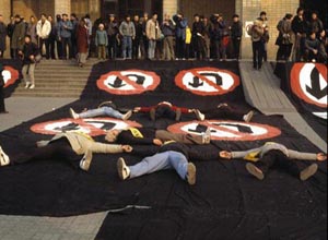 1989年2月,第一個中國現(xiàn)代藝術大展,藝術家們在不準調(diào)頭的標識上展示創(chuàng)意。 | 我們的工作室越來越大了,我們的展覽越來越多了,我們的飯局越來越豪華了……我們的思念越來越淺了,遺忘能力越來越強了,孤獨越來越深了,記憶越來越短了,我們的過去越來越遠了——