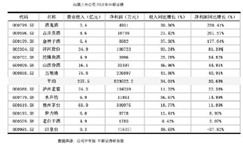 海通證券對白酒上市公司的中報進行分析稱,上半年白酒上市公司收入利潤合計增速維持高位,主要在于2009年上半年基數(shù)較低:13家白酒上市公司上半年實現(xiàn)收入257.5億,同比增長34%,其中一季度收入增長35%,二季度收入增長33%,上半年實現(xiàn)凈利潤83億,同比增長30.7%,其中一季度凈利潤同比增長28%,二季度凈利潤增長34.5%。 報告預(yù)計今年下半年白酒企業(yè)收入將逐步放緩至平穩(wěn)狀態(tài)10%左右,但下半年合計凈利潤增速仍將維持高位,同比增長將達約35%左右。預(yù)計全年13家白酒上市公司合計收入和凈利潤增速分別為19%和29%左右,這個增長速度仍舊足以讓白酒股獲取超額收益。從6—7月份高檔白酒終端零售價的普漲來看,估計很多白酒公司三季度的發(fā)貨量將得到可靠保障,經(jīng)銷商補庫存的過程可能將一直延續(xù)到明年春節(jié)。 海通證券認(rèn)為,上半年白酒企業(yè)凈利潤增速低于收入增速主要是因為消費稅率提高了2—3個百分點,但下半年翹尾因素逐步減弱,凈利潤增速將逐步恢復(fù)。中國政府從2009年下半年開始提出從嚴(yán)增收消費稅,而公安部門也在去年底從嚴(yán)打擊酒駕,并于今年4月份嚴(yán)格規(guī)范交通法。中長期來看,無論是酒精飲料的消費稅,還是其他行政、法律,對酒精飲料消費的限制力度都會提高。中長期來看,“少喝酒、喝好酒”是大勢所趨,白酒業(yè)中長期產(chǎn)品結(jié)構(gòu)調(diào)整仍將深化。