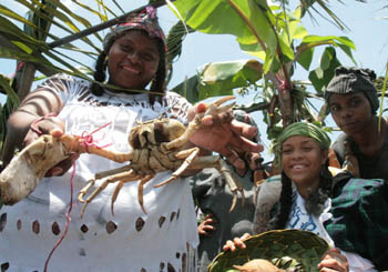 與陽光共同躍動的加勒比音樂,與腰肢一起搖曳的蘆葦草裙,熙熙攘攘的人群,鮮美的螃蟹海鮮湯和金黃色的烤魚,這就是尼加拉瓜加玉米島上每年8月末都要上演的重頭戲——螃蟹節(jié)。 由首都馬那瓜出發(fā),乘坐只能容納9人的微型螺旋槳式飛機(jī),經(jīng)過約兩小時的空中顛簸,記者終于來到了位于尼加拉瓜東南部加勒比海域的玉米島。這座小島方圓幾十平方公里,終年氣候溫潤,雨量豐沛,隨處可見高大挺拔的棕櫚樹和椰子樹。還沒來得及細(xì)細(xì)欣賞熱帶島嶼的美景,皮膚黝黑的當(dāng)?shù)貪O民已經(jīng)開始熱情地招呼我們參加“螃蟹節(jié)”的慶祝活動。 只見數(shù)千名當(dāng)?shù)鼐用窈陀^光客都聚集在一個接近海邊的廣場,觀看盛裝舞者的表演。廣場中央,古銅膚色的加勒比少年頭戴面具,腰圍草裙,手持標(biāo)槍,正在重現(xiàn)祖先勇斗敵人和猛獸的場景;笑容甜美的加勒比少女則頭纏絲帶,手持椰子殼做成的工具,為游人展示捕捉魚蝦螃蟹的技巧。一只只用彩色紙張糊成的大魚小蟹徐徐“游過”他們的身邊,顯得既生動又新奇。不少漁民還將自家打撈上來的螃蟹拿出來炫耀,和歌舞表演交相呼應(yīng)的,是四周擺放的各類當(dāng)?shù)匦〕院凸?jié)日大餐。心靈手巧的加勒比婦女利用一切可以找到的原生態(tài)材料來準(zhǔn)備這場節(jié)日的盛宴,她們在路邊架起大鍋,為游人熬制最具熱帶海島風(fēng)情的“海鮮螃蟹湯”。洋蔥、番茄、螃蟹、魚肉和椰子,這些原料被主婦們放在一起熬制數(shù)個小時,再將乳白色的湯汁盛入干椰子殼做成的碗中,就做成了一道最令人流連忘返的美味佳肴,如果還能配上一份用蘆葦葉包裹的紅豆飯,那種滋味匯聚在游人的口中和心里,最終將化作對大自然美好的感嘆。在這里,所有人都忘卻了喧囂都市中的百般禁忌,隨處可見載歌載舞的游人和大快朵頤后仍意猶未盡吮吸手指的食客。 關(guān)于“螃蟹節(jié)”的由來,還有著一段曲折的歷史。據(jù)當(dāng)?shù)厝苏f,168年前,尼加拉瓜加勒比地區(qū)的民眾飽受奴隸制度的剝削和折磨,后來人們通過努力廢除了舊制度,獲得了自由幸福的生活。自此之后,每年的這個時候,當(dāng)?shù)鼐用穸家┥献钇恋囊路,制作最美味的食品,通過舞蹈和歌聲,來表達(dá)心中對美好生活的無限憧憬,對大自然饋贈的感恩之情,同時還要祈禱來年的風(fēng)調(diào)雨順。 加勒比海淺藍(lán)色的浪花拍打著海岸,溫暖的海風(fēng)輕輕吹過玉米島上歡慶的人群。如今,盡管奴隸制度已經(jīng)風(fēng)吹云散,但曾經(jīng)的勝利和喜悅卻沿襲至今。慶!绑π饭(jié)”的獨特習(xí)俗已經(jīng)在尼加拉瓜人當(dāng)中扎了根,一定還會代代相傳。