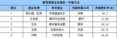 海通證券日前發(fā)布了基金經(jīng)理投資業(yè)績排名報告,這份報告按基金經(jīng)理的任期而不是按基金過往業(yè)績進行了統(tǒng)計。銀華富裕主題的王華,華商盛世成長的梁永強、莊濤、孫建波,華夏大盤的王亞偉,基金通乾的劉澤兵等均以較優(yōu)秀的業(yè)績成為同業(yè)中的明星。