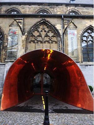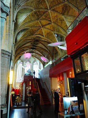 繞過(guò)老教堂,后面一座古老的建筑便是著名的柯瑞舍倫酒店(Kruisherenhotel),一所教堂改造的五星級(jí)豪華酒店。一個(gè)金色的大喇叭竟然就是酒店的入口,看起來(lái)有點(diǎn)不倫不類,不過(guò)當(dāng)入口那端的自動(dòng)門(mén)打開(kāi)時(shí),豁然開(kāi)朗,一座漂亮的教堂大廳出現(xiàn)在眼前。