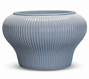 天藍(lán)釉百條缸”內(nèi)外施天藍(lán)釉,釉色恬淡勻雅,精工細(xì)致。最為難得的是,器身為直柳條紋,恰恰為一百根,均勻分布,此制作工藝要求極高,非常難得,因此,成品數(shù)量有限。據(jù)所查資料,僅中國(guó)國(guó)家博物館、上海博物館等少數(shù)幾家大型博物館有與此件造型、釉色和制作工藝相同的類似收藏?梢哉f此作品無論從制作水準(zhǔn)以及收藏的機(jī)構(gòu)等各方面看,都具備官窯水準(zhǔn),雖然為無款,但從造型、釉色上分析,均為頂尖級(jí)作品,傳世罕見,當(dāng)為無款官窯的代表作。