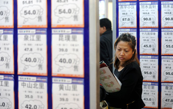 近日,在天津國(guó)際展覽中心,一名市民在2010秋季天津房交會(huì)上的售樓信息板前駐足。新華社記者 李木子
