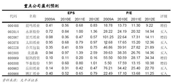 太平洋證券則重點(diǎn)推薦造紙業(yè)。報(bào)告稱,今年上半年造紙及紙制品行業(yè)24家A股上市公司共實(shí)現(xiàn)歸屬母公司凈利潤(rùn)23.07億元,同比增加15.34%。金融危機(jī)后,隨著宏觀經(jīng)濟(jì)的整體向好,造紙行業(yè)下游恢復(fù),出現(xiàn)量?jī)r(jià)齊升的良好局面。而人民幣升值與節(jié)能減排的利好因素將為行業(yè)四季度的持續(xù)走強(qiáng)提供保障,預(yù)計(jì)2010年全年,造紙包裝行業(yè)與優(yōu)勢(shì)企業(yè)將實(shí)現(xiàn)業(yè)績(jī)的快速擴(kuò)張。