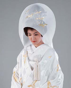 與中國(guó)結(jié)婚典禮新娘往往穿著大紅大綠不同,日本神前婚禮時(shí)的新娘卻是一身白——身著白色的稱為“振袖”的白色長(zhǎng)袖和服,上披白色和式罩衫,稱為“白無(wú)垢”,據(jù)說白色是為了讓新郎來染成自己喜歡的顏色,或者是為了證明新娘的純潔。新娘還梳著稱為“文金高島田”的高高的日本發(fā)髻,戴白色絲棉帽子或者蒙白頭紗,胸部插著荷包或者短劍(用于護(hù)身或自殺,現(xiàn)作為裝飾),腳穿白色的日式短布襪,穿草履。新郎則著裝簡(jiǎn)單,穿黑色的在肩部、胸和后背飾有家徽的和服、帶條紋的和服裙子,外著短外罩,腳穿日式短布襪,著草履。
