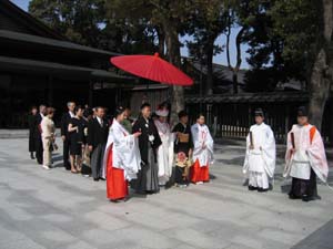 神前婚禮主要分為“參拜之儀”,新郎新娘、雙方父母、親屬入場(chǎng);“手水之儀”,大家洗手后進(jìn)入會(huì)場(chǎng);“修禊之儀”,驅(qū)邪清心,神官念誦修禊詞,為新郎新娘和雙方親屬祈福;“祝詞之儀”,神官將兩人的結(jié)婚通告神,祈求保佑;“三獻(xiàn)之儀”,新郎新娘交替用三個(gè)酒杯飲酒,結(jié)成夫妻婚約,由于要分三次喝三杯酒,所以被稱為“三三九度”;“誓祝奏上”,新郎新娘在神前宣讀誓詞,并且將原稿供奉到神前;“玉串奉奠”,玉串(楊桐樹帶葉小枝,上纏白布條)據(jù)說發(fā)揮了將神和人的心連在一起的作用,新郎新娘從巫女手中取過玉串后奉獻(xiàn)在神前,“二拜、二拍手,一拜”;“戒指交換之儀”,新郎新娘互相將戒指帶到對(duì)方無(wú)名指上,這是現(xiàn)代受西方影響出現(xiàn)的;“神樂奏上”,伶人演奏雅樂,巫女表演舞蹈;最后,全體起立,親屬飲干巫女斟好的供奉給神的酒,表示雙方親屬結(jié)成親戚。神官退場(chǎng)后,新郎新娘、媒人、親屬依次退場(chǎng),儀式轉(zhuǎn)移到喜宴。