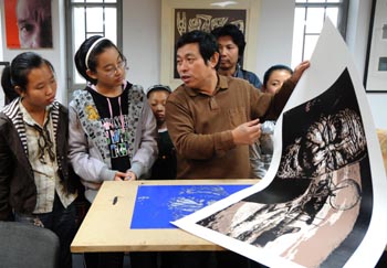 “版畫和其他的繪畫相比有很多的優(yōu)勢,版畫和人們的生活接觸最密切,房間里的裝修裝飾、公共空間的裝潢選擇版畫是最適合的,它最出效果,而且能夠跟設(shè)計(jì)吻合!