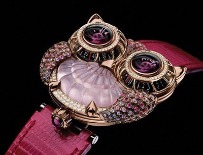 可愛的貓頭鷹表是由Boucheron & Maximilian Büsser (MB&F)設(shè)計(jì)的, 表盤的外觀設(shè)計(jì)就象是一只貓頭鷹,兩只眼睛分別用于時針和分針,整體鑲嵌了不同價值連成的材料:黃金,白金,紫水晶石英,碧石英和鉆石,而且顏色形狀配合得恰到好處,好精致好完美, 相信價格更加不匪了,連我不喜歡帶表的人都想要一塊了。