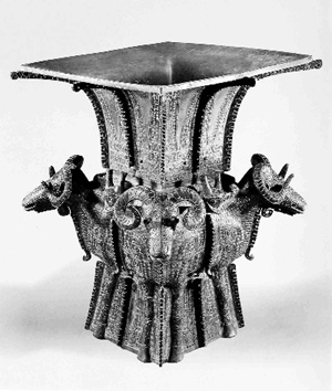 夏商周時期我國青銅制造業(yè)發(fā)達,青銅器造型豐富、種類繁多,有酒器、食器、水器、兵器、車馬器、生活用具等各樣器物。其中酒器包括飲酒器、盛酒器、調(diào)酒器和溫酒器,主要有爵、角、觚、觶、觥、尊、缶等20多個器種!白稹笔且环N盛酒器,一般為圓形、鼓腹、大口,但也有少數(shù)方形尊,四羊方尊便是其中一例,它們一般屬于禮器或祭祀用品。