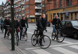 在哥本哈根,自行車的平均時速為15公里,而汽車平均時速僅為27公里。丹麥交通管理局對于自行車綠色通道的設(shè)計,使得騎車人可以維持20公里的時速,且不受紅燈的干擾。另外,十字路口的自行車?烤比汽車?烤靠前5米,自行車可以在汽車右轉(zhuǎn)之前優(yōu)先通過十字路口。而在部分交通繁忙的區(qū)域,自行車道也已被拓寬為雙車道來緩解日益增長的交通壓力。