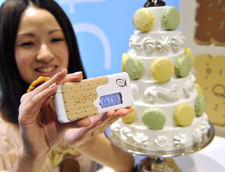 日本手機(jī)運(yùn)營商N(yùn)TT多科莫去年曾推出巧克力外形的手機(jī),今年再次推出以食物為外形的手機(jī)。圖為一名模特在日本首都東京展示外殼形似餅干的SH-04C型手機(jī)。