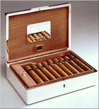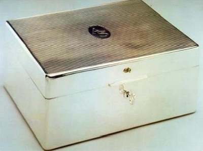 引人注目的—華麗的銀質(zhì)雪茄盒,有著一定的重量和流行的樣式,它的蓋子做成優(yōu)雅的線條模式,除了蓋子之外,什么地方都看不到接口,邊棱