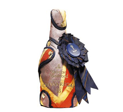 Westwood也來插手瓶身設(shè)計,當(dāng)然不會選擇高調(diào)到爆的Absolute和Evian,而是幾乎很少引起時尚界話題的老牌酒廠Chivas。標(biāo)志性的鮮艷色彩,復(fù)雜的拼貼材質(zhì)讓瓶身看起來非常具有朋克味道,酒瓶中間也少不了Vivienne